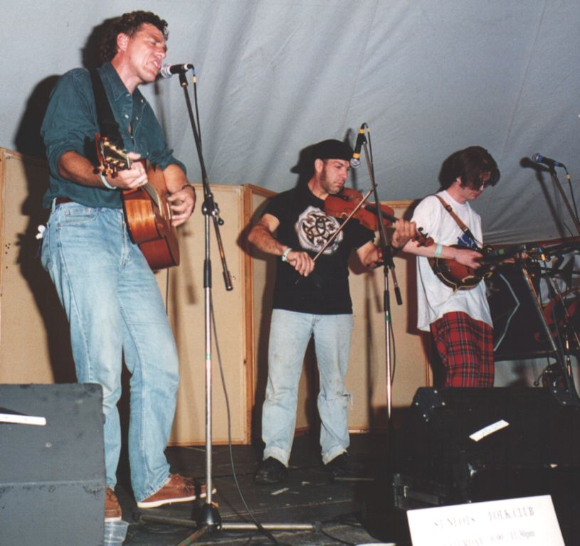 | The fifth version of Hedgepig, which ran from the end of 1993 until the Spring of 1995, was one of the most settled periods of the Hedgepig saga. The band comprised Steve White on vocals and guitar, Steve Matthews on mandolin, banjo and bodhran, and Mark Lemon on fiddle and mandolin. The regular weekly practices, supplemented by continued gigs in local pubs, fine-tuned their material. They also played the club tent at The Cambridge Folk Festival for St Neots Folk Club as well as Cambridge’s Strawberry Fayre.